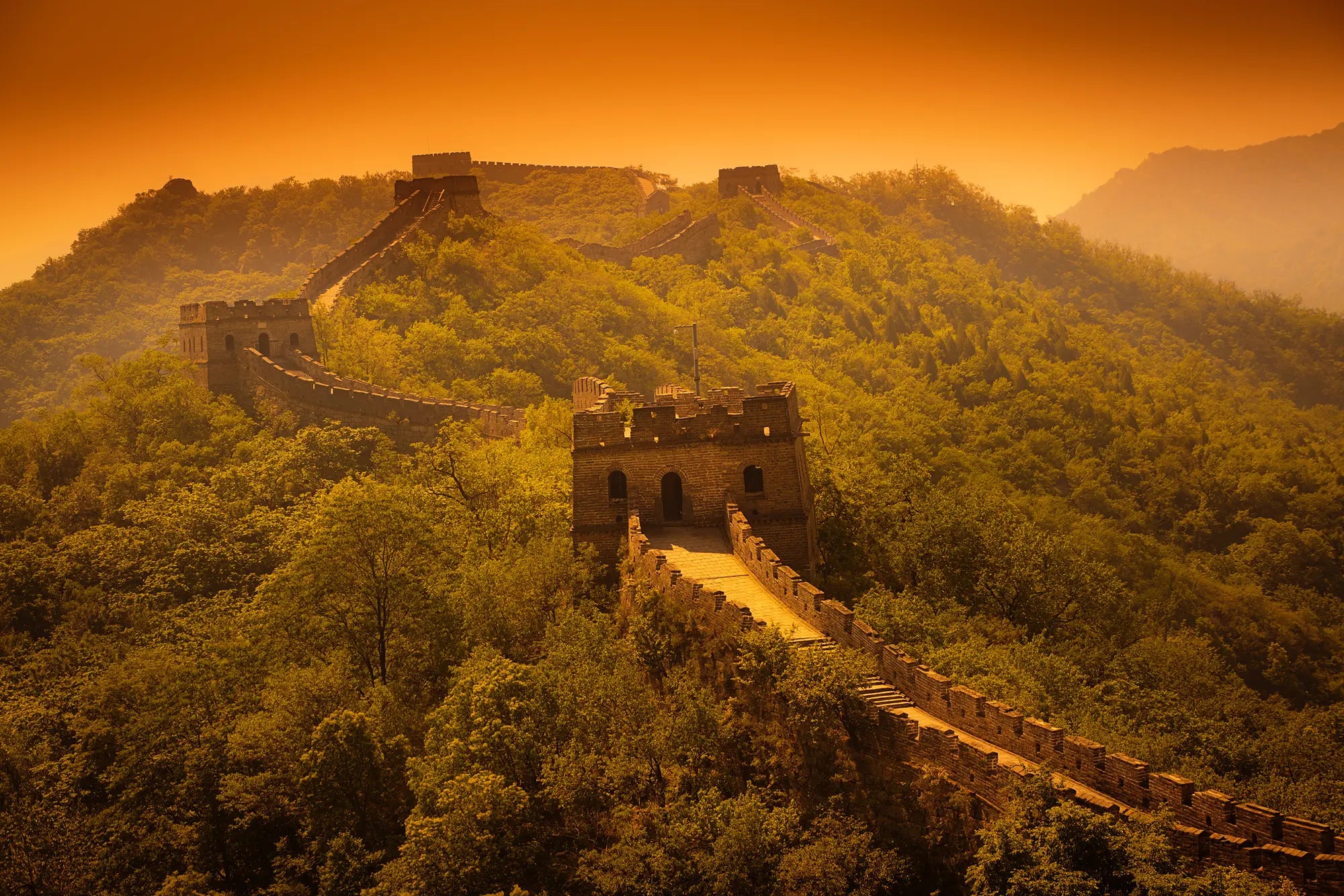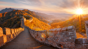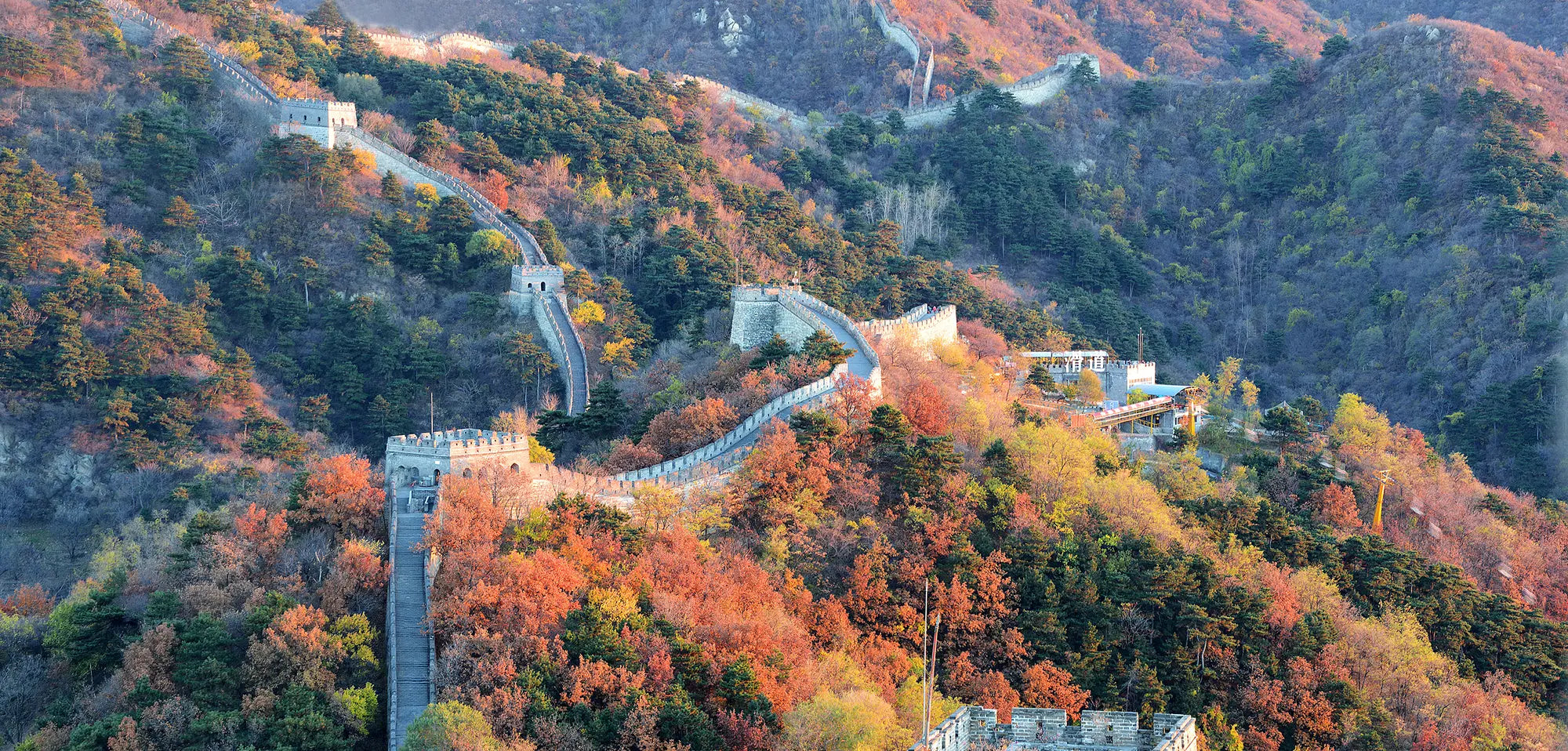 🍂 Autumn: A breathtaking panorama as the Wall winds through fiery red and golden foliage.